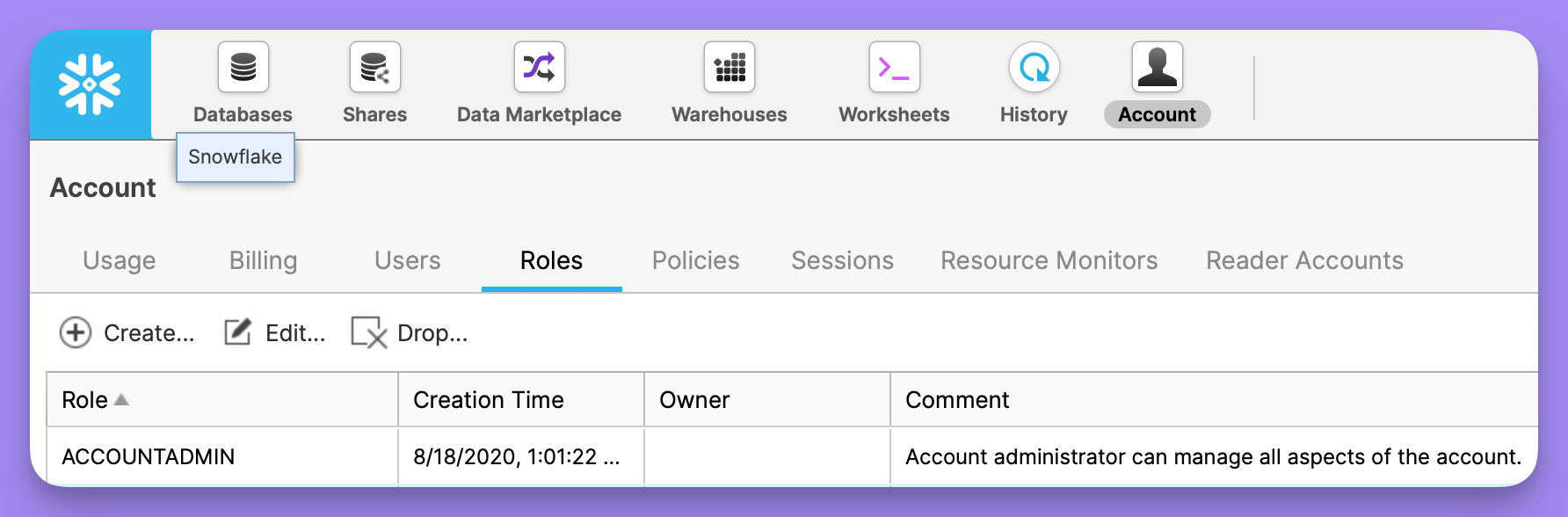 This is the security role that you would like to use when running queries as the specified user. The role must have access to any warehouses, databases, schemas, and tables you want to use. If you’re a Snowflake admin you can list all roles available in the snowflake console: