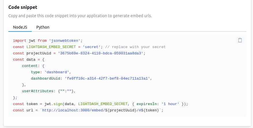 Lightdash provides code snippets you can copy and use in your app to generate valid embed URLs: