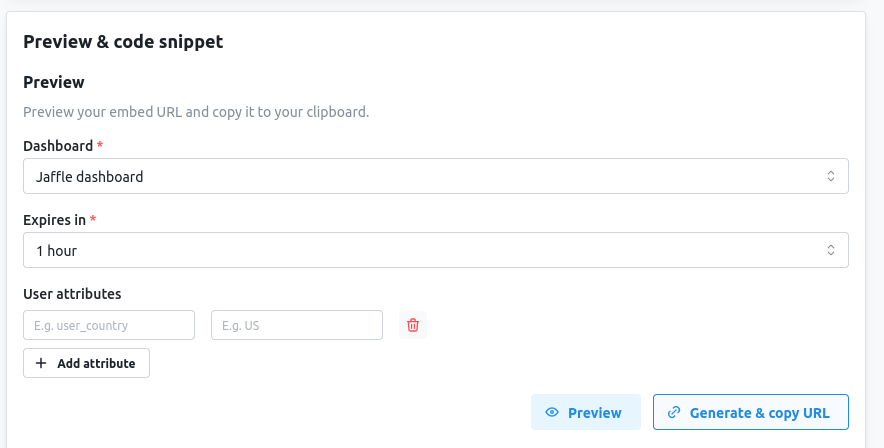 Preview to see how the embedded content will look, and click on Generate & copy URL to get a one-off embed URL for testing.